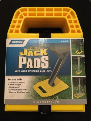 Dewalt stabilizer 2 strap knee pads black universal. They are extremely strong and will support the heaviest vehicles. Camco rv stabilizing jack pads 7. Camco large 44541 rv stabilizer jack pads. Instead of using several pieces of plywood or a wooden block which are not designed to really work as jack pads, we use this camco product which has been developed specifically for this task. There are no reviews for this product. Technoflex hp0608 hush pad ii. Made from 100% recycled tires it is extremely resistant and is designed be used under the stabilizer and will support any weight. Great for all kinds of jacks, scissor, stacker or drop leg. What about just installing snappad jack stand pads? They will not bend and break on uneven surfaces, (like the plastic models) and help reduce vibration. They are so much better in terms of portability because they come with plastic rope handles. Camco's stabilizer jack pads measure 6.5 in.